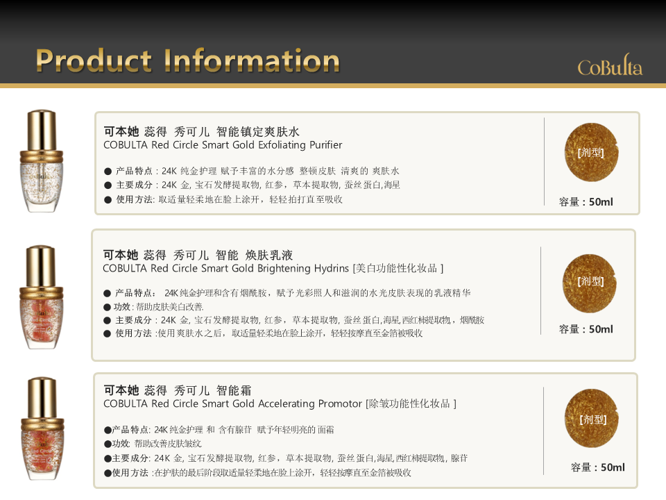 | 전성분 | 코불타 레드서클 스마트 엑스폴리에이팅 퓨리파이어정제수, 부틸렌글라이콜, 서양장미꽃수, 변성알코올, 글리세린, 피이지-60하이드로제네이티드캐스터오일, 트로메타민, 카보머, 초피나무열매추출물, 어스니어추출물, 할미꽃추출물, 디소듐이디티에이, 세리신, 효모/오팔/진주층/터키석/다이아몬드발효용해여과물, 홍삼추출물, 하이드롤라이즈드불가사리추출물, 금, 은행잎추출물, 엉겅퀴꽃/잎/줄기추출물, 겐티아나추출물, 쑥추출물, 아르니카꽃추출물, 서양톱풀추출물 |