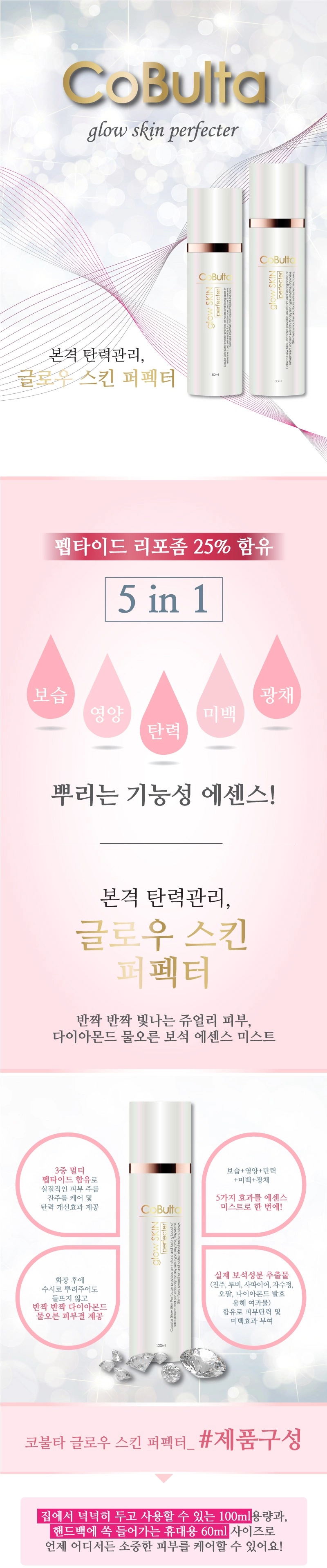 | 전성분 | 정제수, 서양장미꽃수, 부틸렌글라이콜, 메칠프로판디올, 알부틴, 변성알코올, 벤질글라이콜, 마카다미아씨오일, 카프릴릴메치콘, 프로필렌글라이콜, 글리세린, 피이지-60하이드로제네이티드캐스터오일, 슈크로오스디스테아레이트, 스쿠알란, 부톡시디글라이콜, 산양삼추출물, 마치현추출물, 디메치콘, 1,2-헥산디올, 세테아릴알코올, 토코페릴아세테이트, 포타슘세틸포스페이트, 아데노신, 라스베리케톤, 카프릴릴글라이콜, 팔미토일펜타펩타이드-4, 팔미토일펜타펩타이드-3, 아세틸헥사펩타이드-8, 디소듐이디티에이, 소듐하이알루로네이트, 비에이치티, 트리세테아레스-4포스페이트, 하이드롤라이즈드콜라겐, 포도씨오일, 레시틴, 황색5호, 황색4호, 향료, 진주추출물, 효모/오팔/진주층/터키석/다이아몬드발효용해여과물, 루비추출물, 사파이어추출물, 자수정추출물 |