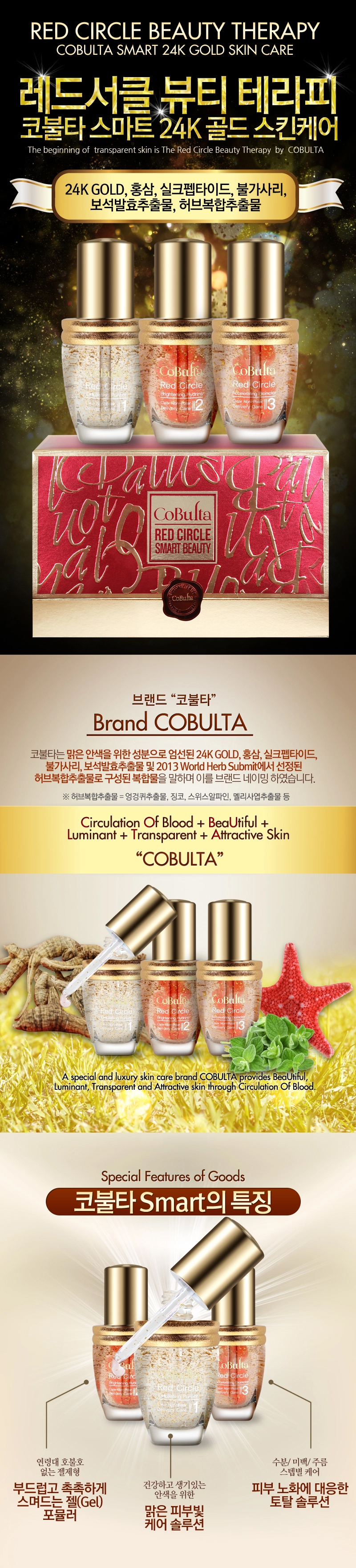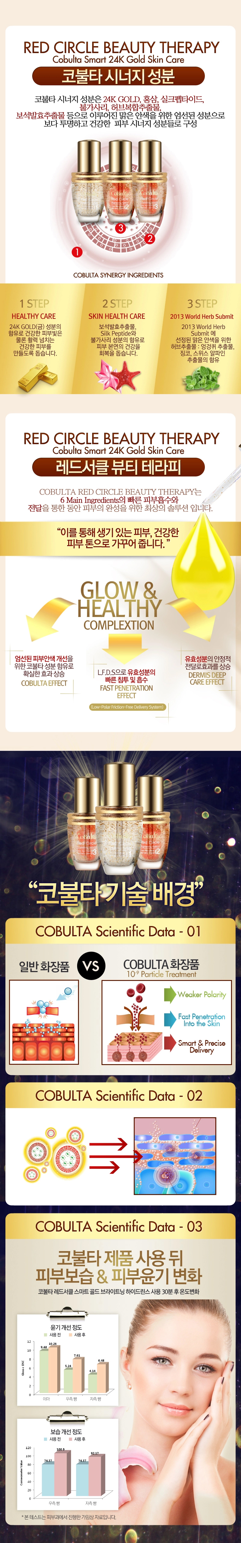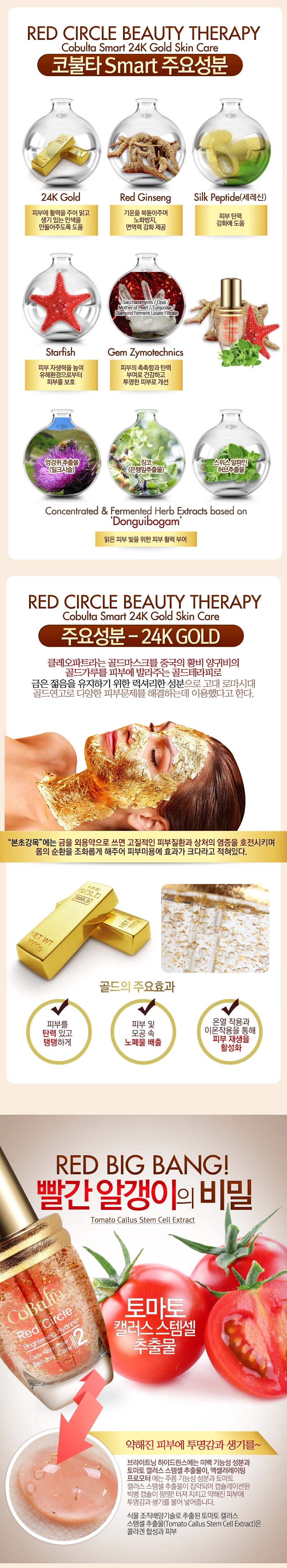 | 전성분 | 코불타 레드서클 스마트 엑스폴리에이팅 퓨리파이어정제수, 부틸렌글라이콜, 서양장미꽃수, 변성알코올, 글리세린, 피이지-60하이드로제네이티드캐스터오일, 트로메타민, 카보머, 초피나무열매추출물, 어스니어추출물, 할미꽃추출물, 디소듐이디티에이, 세리신, 효모/오팔/진주층/터키석/다이아몬드발효용해여과물, 홍삼추출물, 하이드롤라이즈드불가사리추출물, 금, 은행잎추출물, 엉겅퀴꽃/잎/줄기추출물, 겐티아나추출물, 쑥추출물, 아르니카꽃추출물, 서양톱풀추출물 |